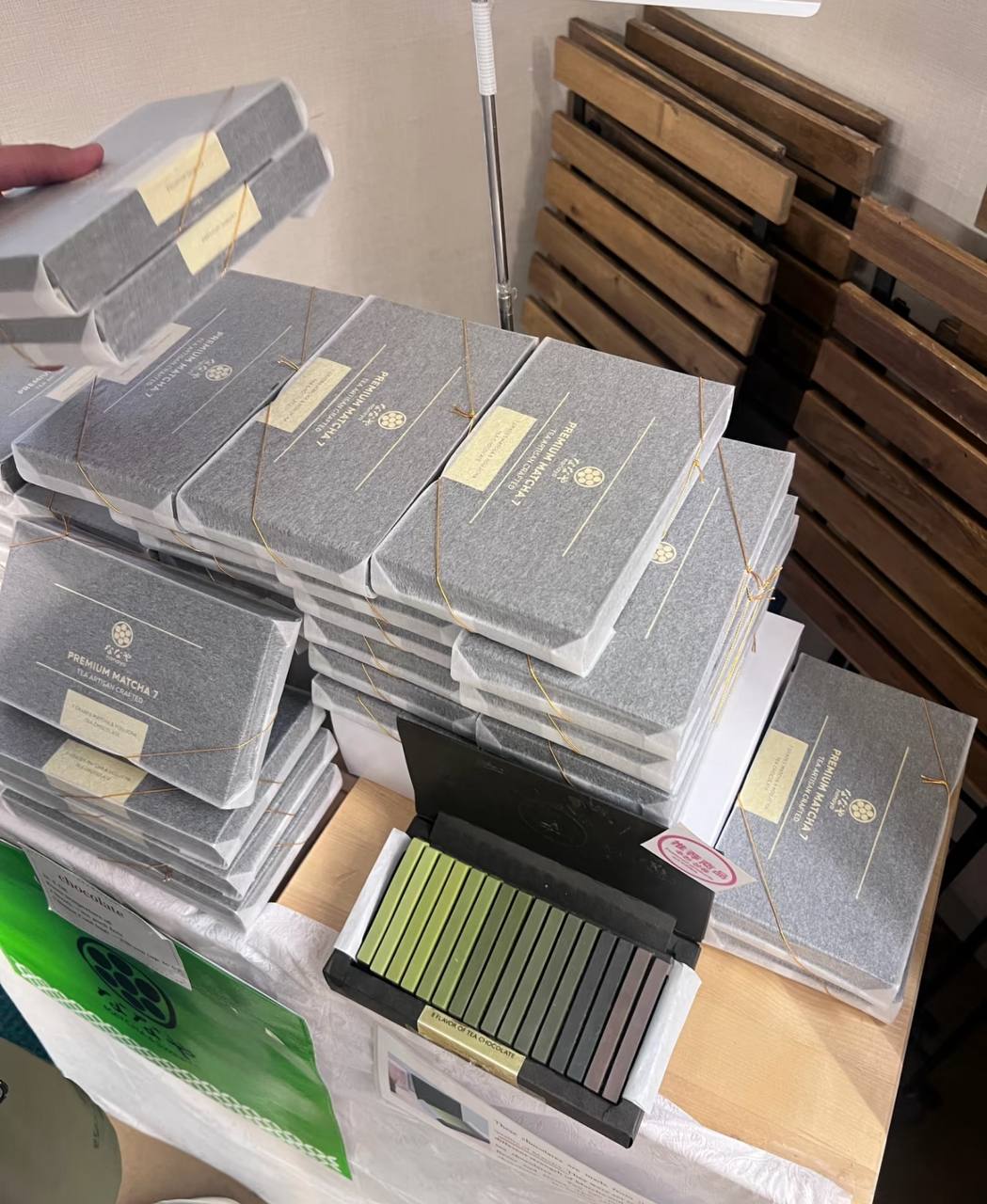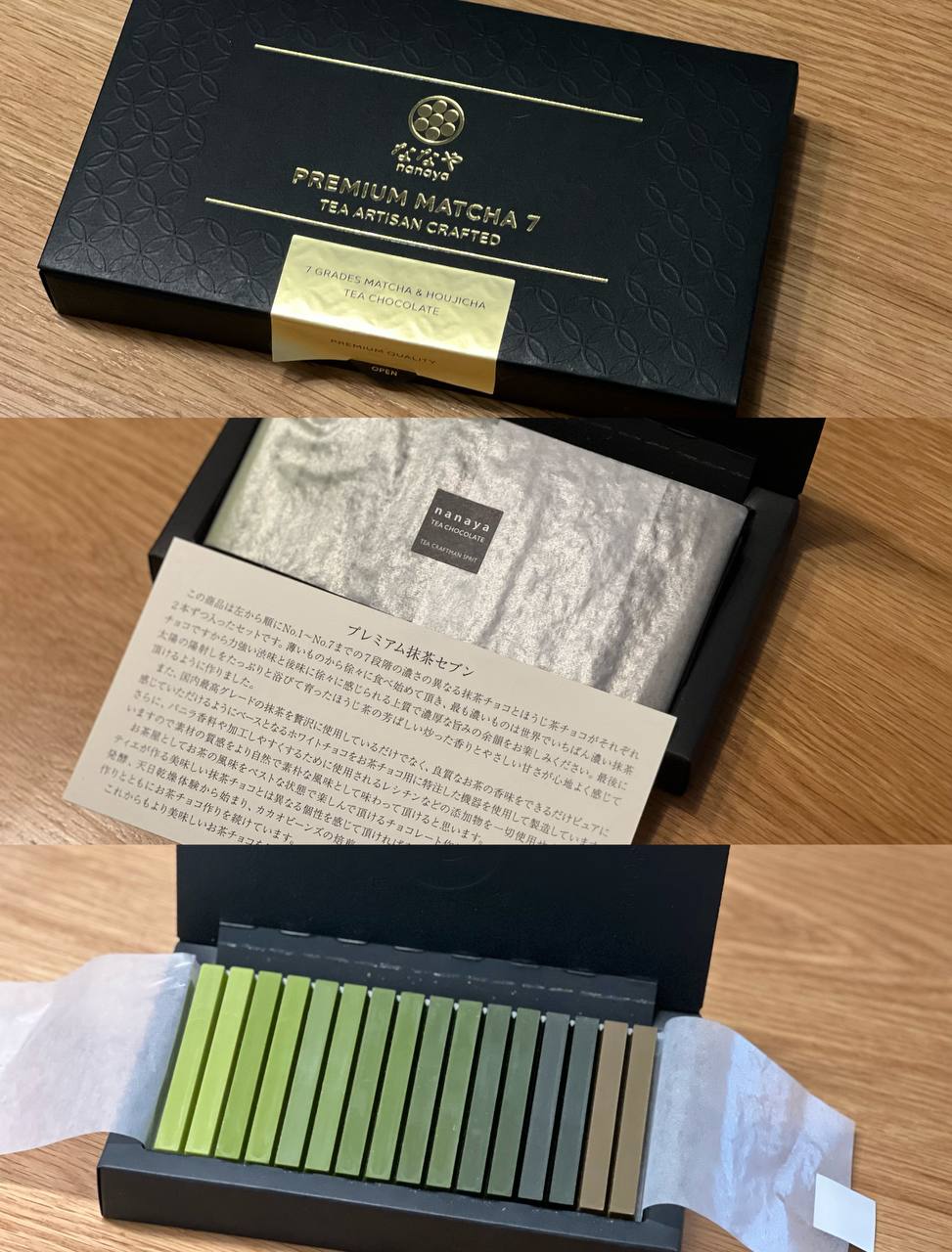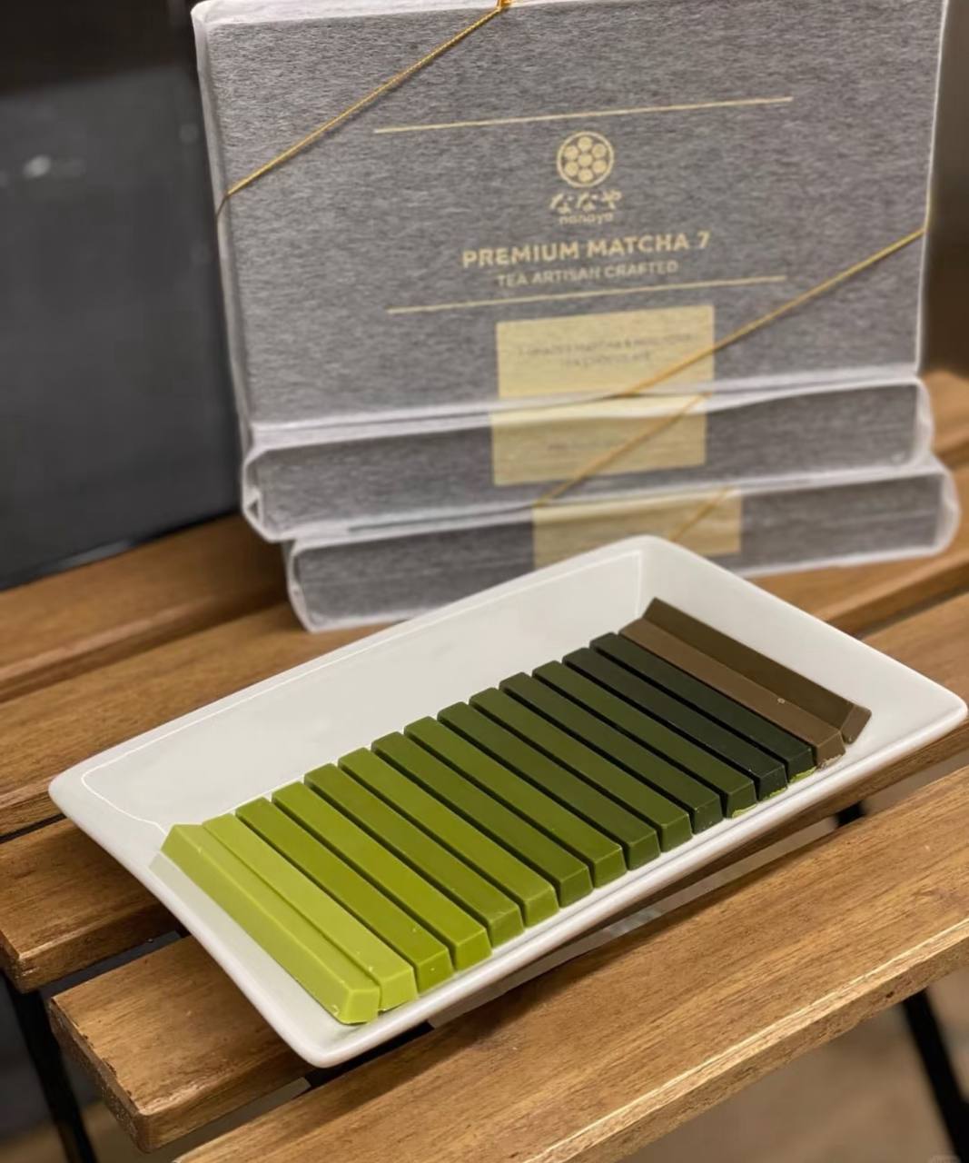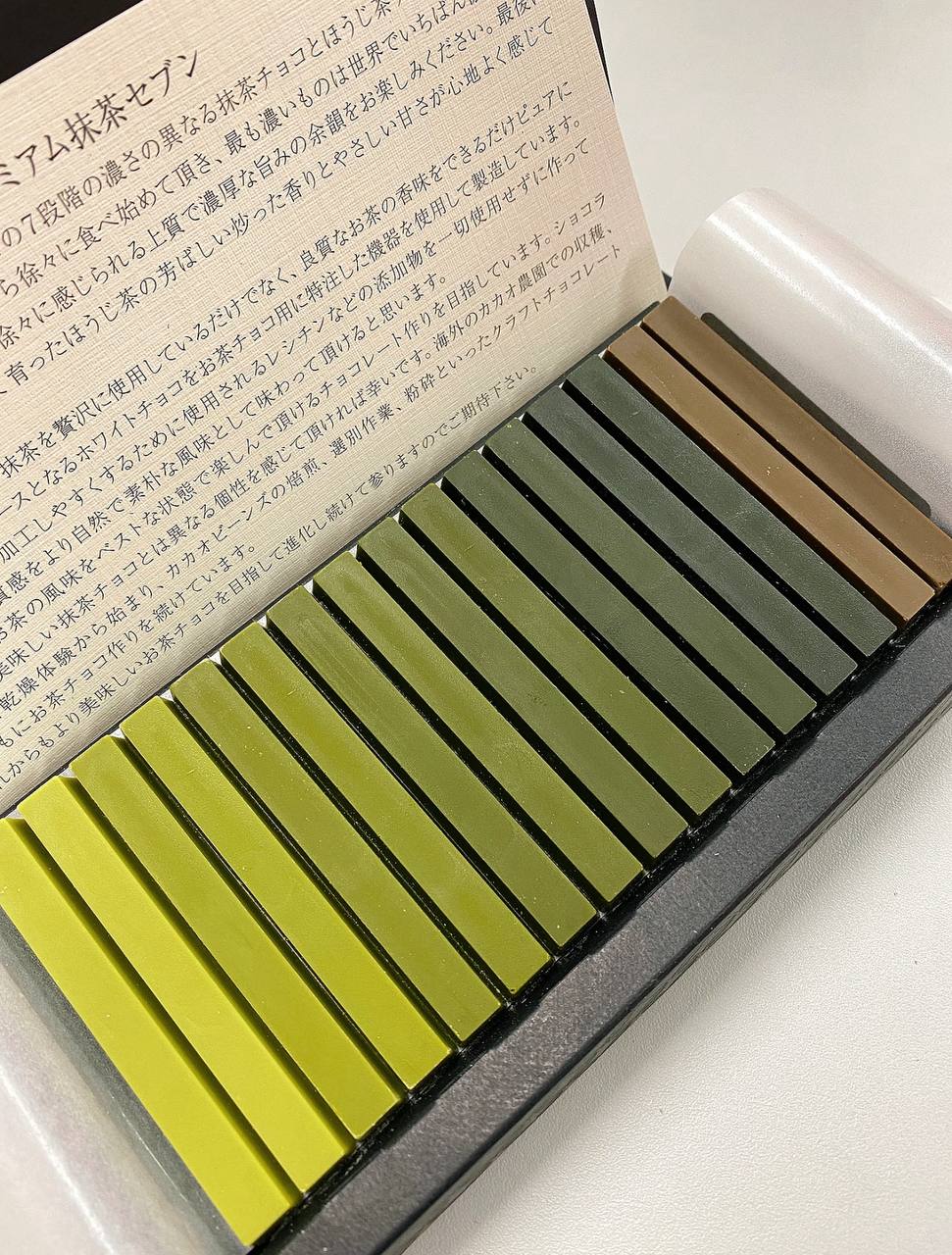 值得一提的浓度最高的第7级是其他品牌的抹茶巧克力无法实现的等级 !因为一般情况下这个浓度的抹茶会因为太稠而无法变形成为产品,Nanaya成功挑战到制作浓抹茶成固体的极限!
