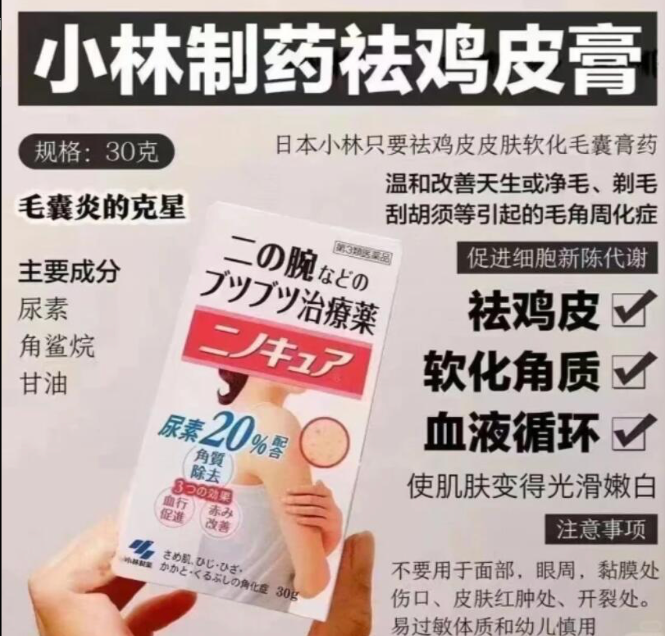 马来西亚全年高温,手臂、腿部总被鸡皮肤和小红点困扰?这款专为鸡皮肤及毛囊角化症研发的修复膏,蕴含尿素、角鲨烷和甘油,深层滋润、软化角质,修复肌肤屏障,长效锁水,让肌肤恢复细嫩。
