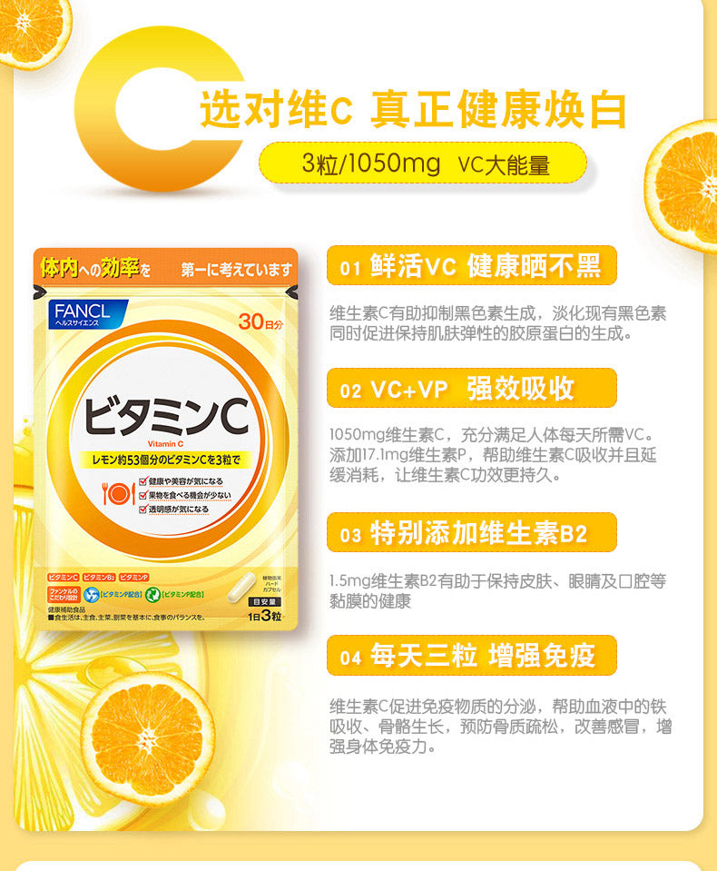 FANCL 维他命C,为你提供全方位的健康支持,从内而外焕发光彩,让你的肌肤更紧致、更亮丽,增强免疫力,保持健康活力!