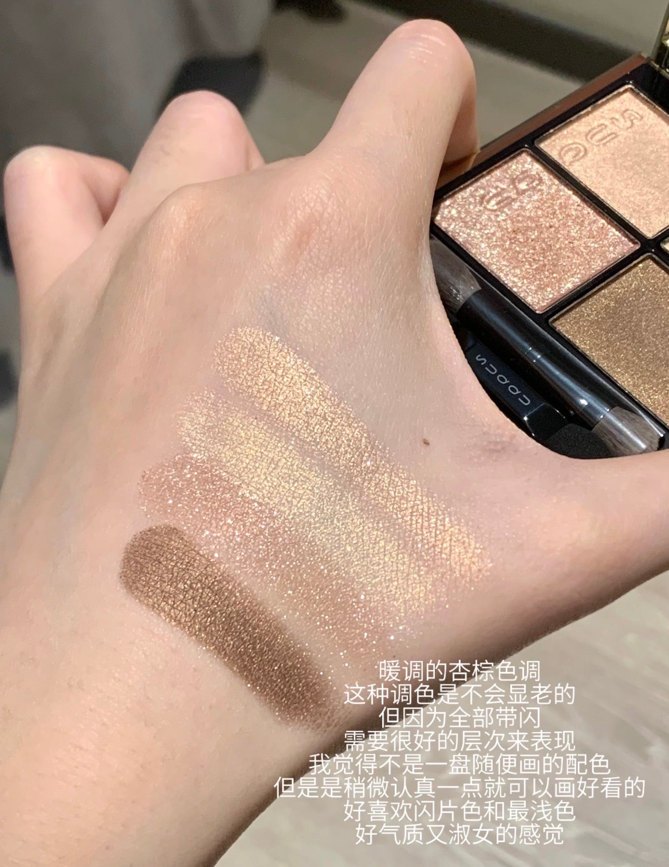 每一盘都是四个不同质地与深浅的颜色组合,搭配起来非常和谐,很容易画出自然又有层次感的眼妆 ~粉质细腻服帖,上眼后不显颗粒感!颜色显色度刚好,不会过于浓重,新手也很好掌握。日常通勤或约会妆都很适合 ~