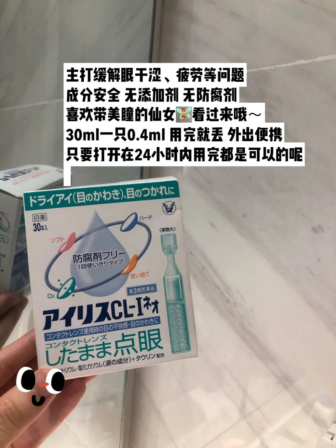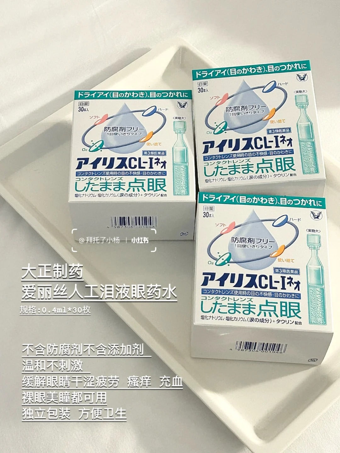 来自日本知名药企 Taisho 大正制药 的人工泪眼药水,专为缓解 眼睛干涩、疲劳、异物感 而研发。配方模拟人体自然泪液,温和无刺激,帮助恢复眼部湿润环境。