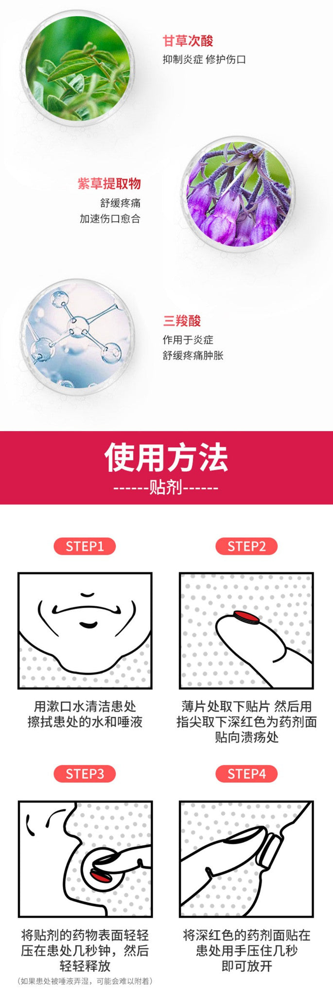 4️⃣ 贴片不会溶解,在口腔中可持续数小时,自然脱落后吐出即可