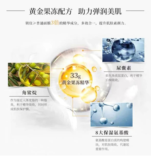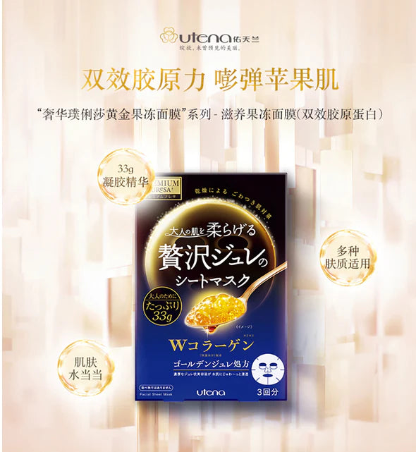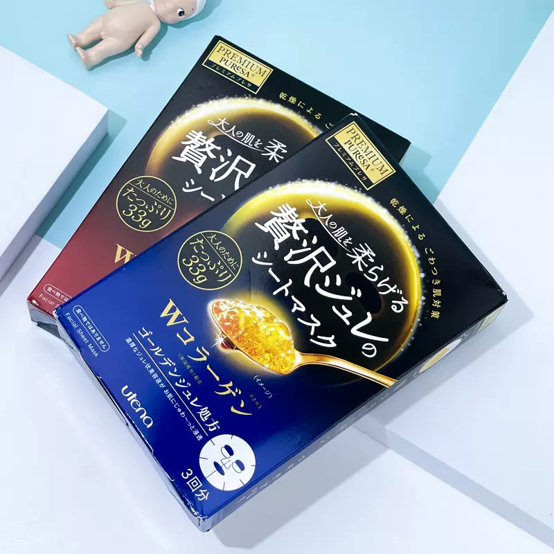来自日本UTENA的Premium Puresa黄金果冻面膜系列,日本畅销面膜,旅游必买清单之一。每片面膜含33克黄金果冻精华美容液,浓厚美容液能快速渗透肌肤角质层,补水锁水,提升弹性,使肌肤柔嫩光滑。
