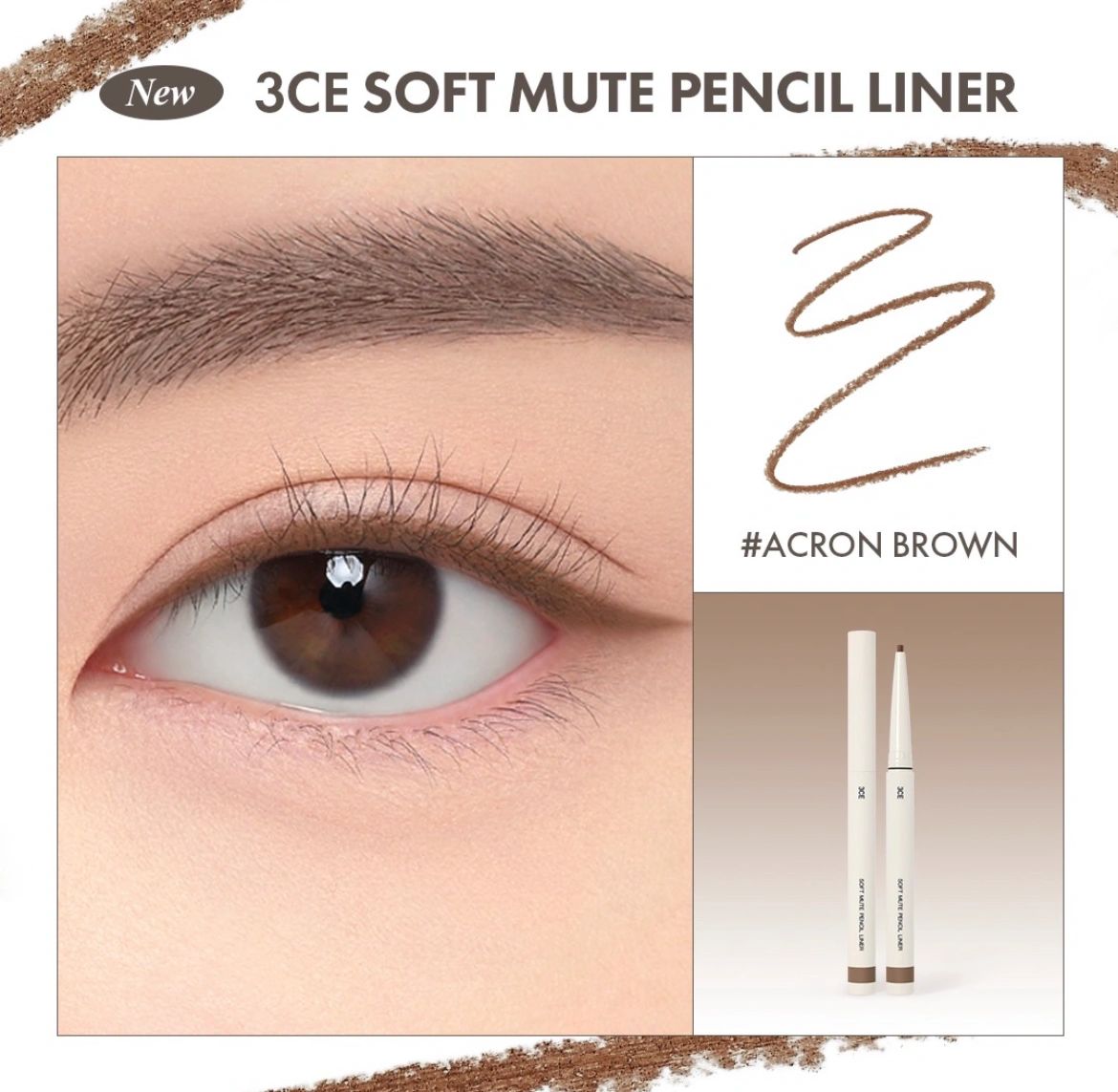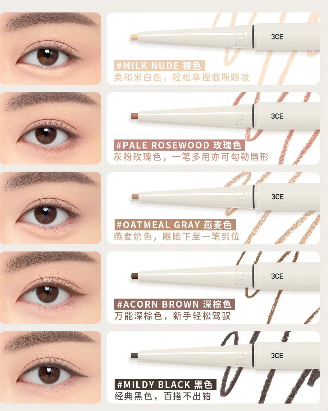 3CE新品2mm哑光眼线笔,笔芯顺滑易上色,饱和度自然,不挑肤色。无论是卧蚕、柔弱妆,还是经典黑棕灰,轻松驾驭。防水耐汗,夏天也不易脱妆。