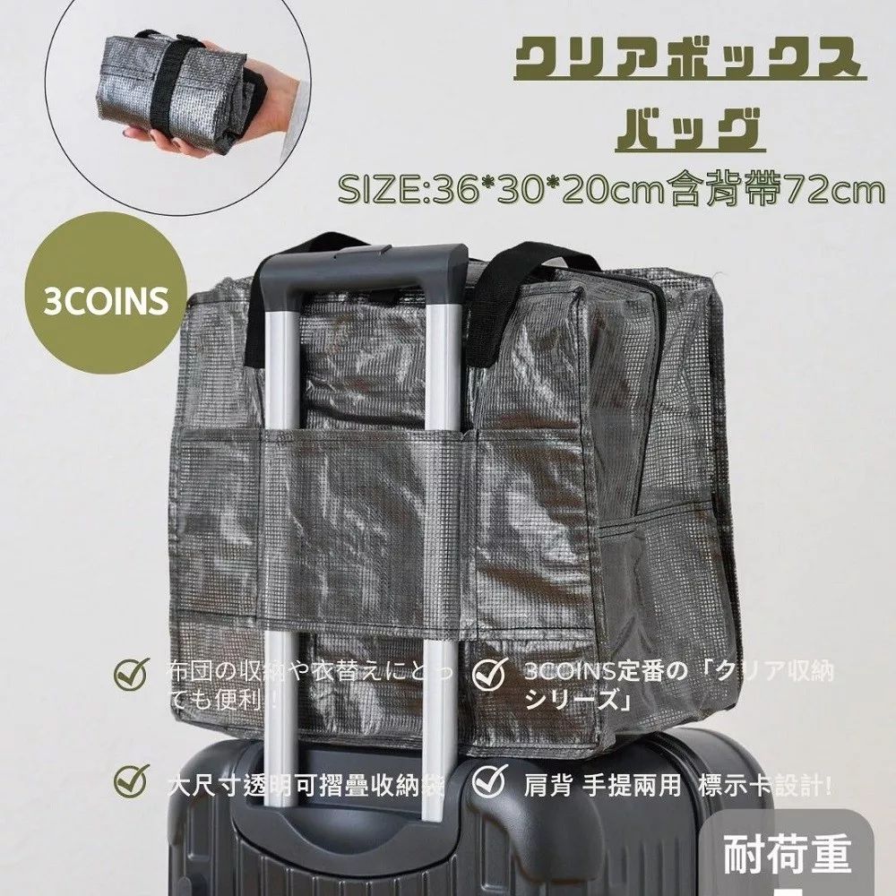 来自日本 3COINS 的折叠随身行李袋,平时可折叠收纳成小包,放在行李箱里几乎不占空间。需要时展开即可获得大容量收纳,适合作为登机随身包或备用行李袋。
